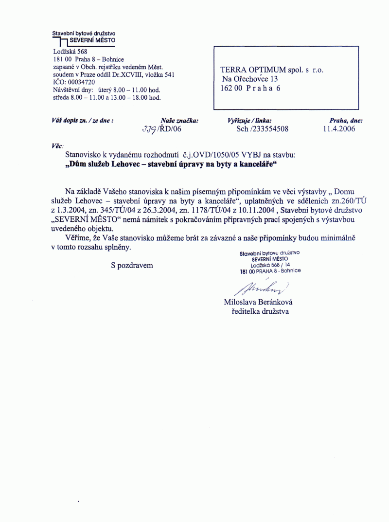 Stavební bytové družstvo Severní Město zaslalo společnosti TERRA OPTIMUM s.r.o. své vyjádření ve kterém konstatuje, že "Stavební bytové družstvo Severní Město nemá námitek s pokračováním přípravných prací spojených s výstavbou uvedeného objektu". Blíže viz dopis ředitelky družstva.