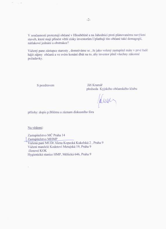 Podána stížnost na nezákonný postup při vedení ústního jednání spojeného s místním šetřením (ústního jednání zúčastnili občané, kteří nebyli účastníky řízení a neprokázali se písemnou plnou mocí a narušovali průběh ústního jednání). Připomínky do protokolu mohly být podány až při pokračování jednání na radnici ÚMČ Prah 14. Celý článek ...