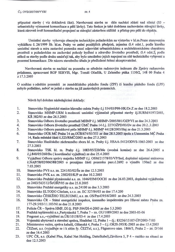 Na písemný dotaz proč Rada MČ Praha 14 neuplatnila své připomínky k velké hmotnosti stavby, které měla v předchozích řízeních odpověděl pan Ing. Miroslav Skala "Postoj městské části k velké hmotnosti stavby je orgánu územního rozhodování znám již z předchozích vyjádření k zahájení územního řízení ze dne 25.3. 2004 a není nutno ho opakovaně vyjadřovat. Navíc členové RMČ měli 18.10. 2005 k dispozici odvolání dalších účastníků řízení, takže měli jistotu, že tato problematika bude i nadále posuzována v odvolacím řízení. S přihlédnutím k výše uvedeným skutečnostem RMČ nepovažovala za nutné, aby se formální k vydanému územnímu rozhodnuti vyjadřovala." Vážení zastupitelé DĚKUJEME za váš postoj jak se staráte o vaše voliče. Občane starej se sám! Blíže viz celý dokument v příloze.
