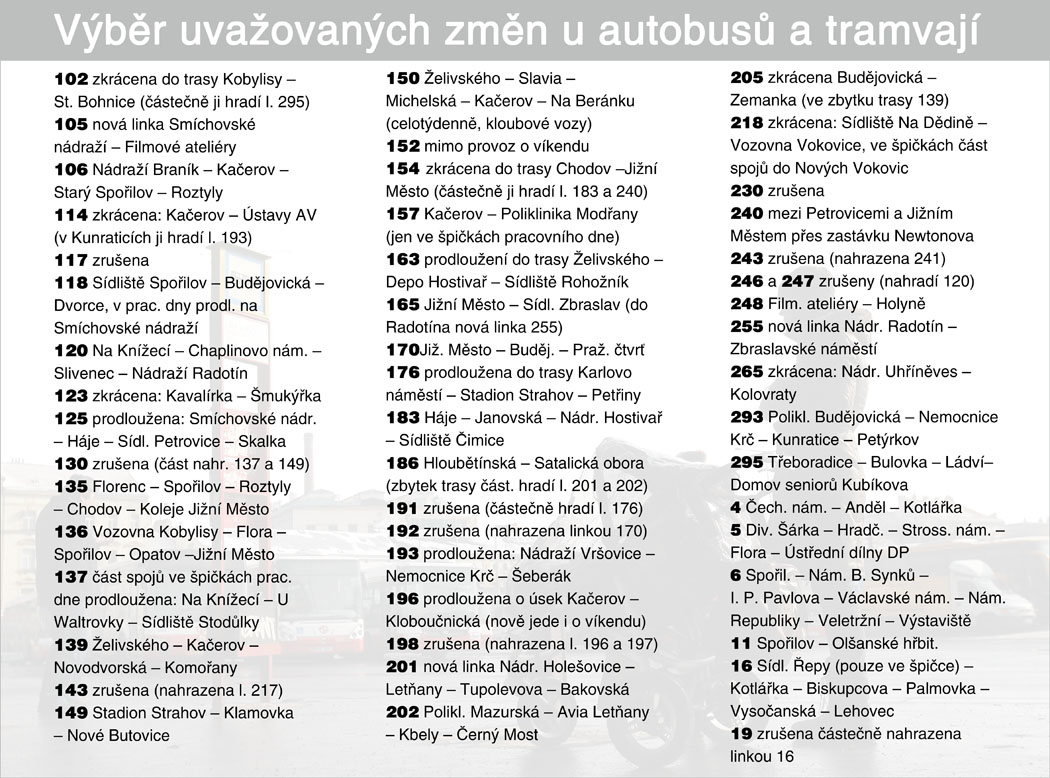 Například je navrženo zrušit tramvajovou linka č. 19 (Lehovec - Nádraží Strašnice) a částečně jí nahradit linkou č. 16 (Sídliště Řepy – Spojovací) prodloužení v trase Palmovka –Vysočanská – Lehovec. Obdobně má být zrušena autobusová linka č. 186 (Nádraží Holešovice - Černý Most) a částečně jí má nahradit linka č. 202 (Poliklinika Mazurská – Bakovská) prodloužením v trase Kbely – Černý Most. Linka č. 163 má být prodloužena do trasy Želivského - Depo Hostivař - Sídliště Rohožník. Blíže viz článek MF dnes.